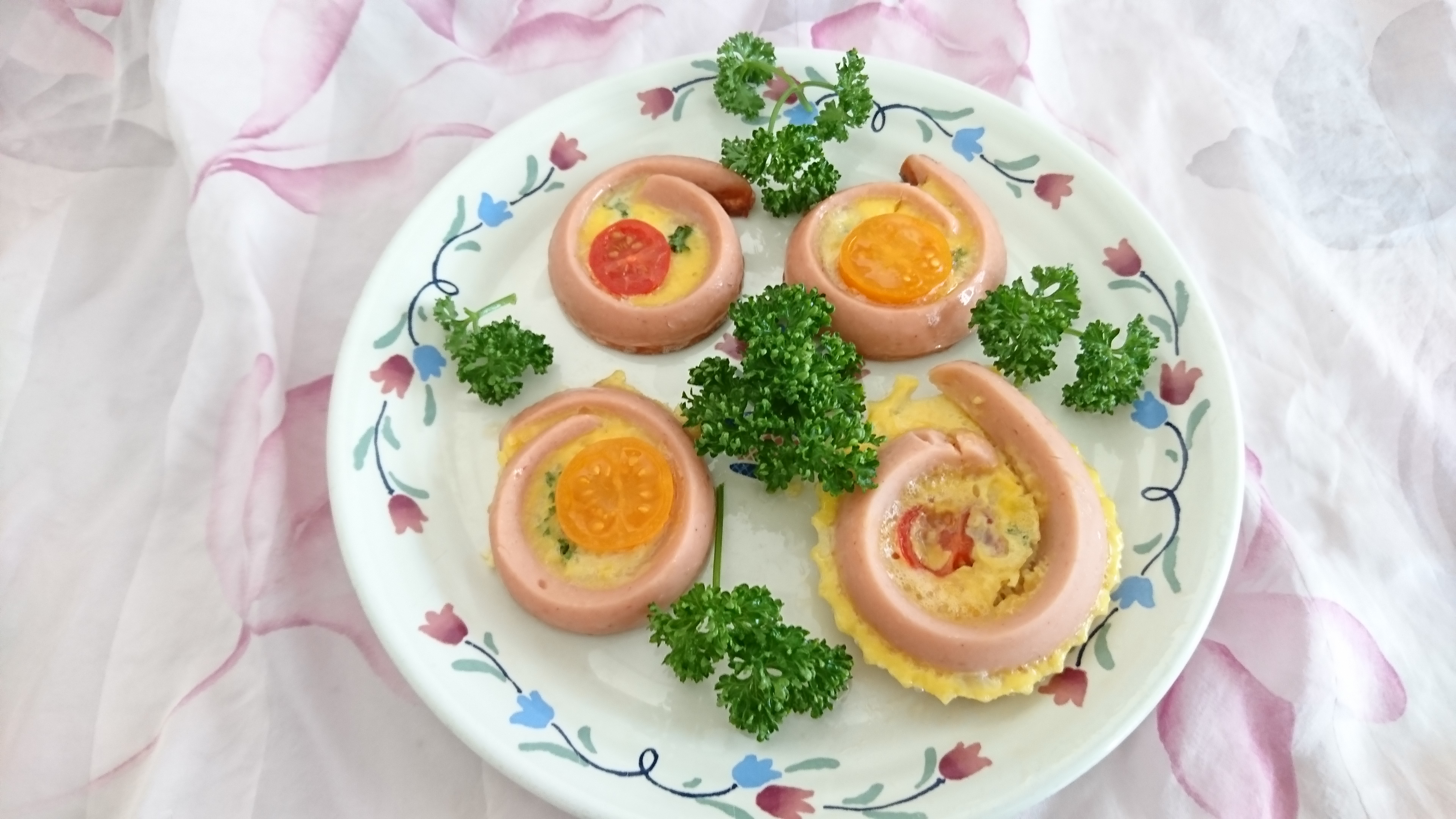 卵と牛乳少々、粉チーズ、塩コショウをし丸めたソーセージの中に入れてトマトとパセリを散らして焼いて出来上がりです。
