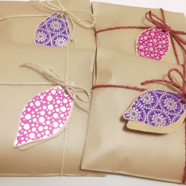 キラキラのカカオを切り抜いて、それと同じ形にクラフトペーパーを切ってメッセージタグを付けてみました♪