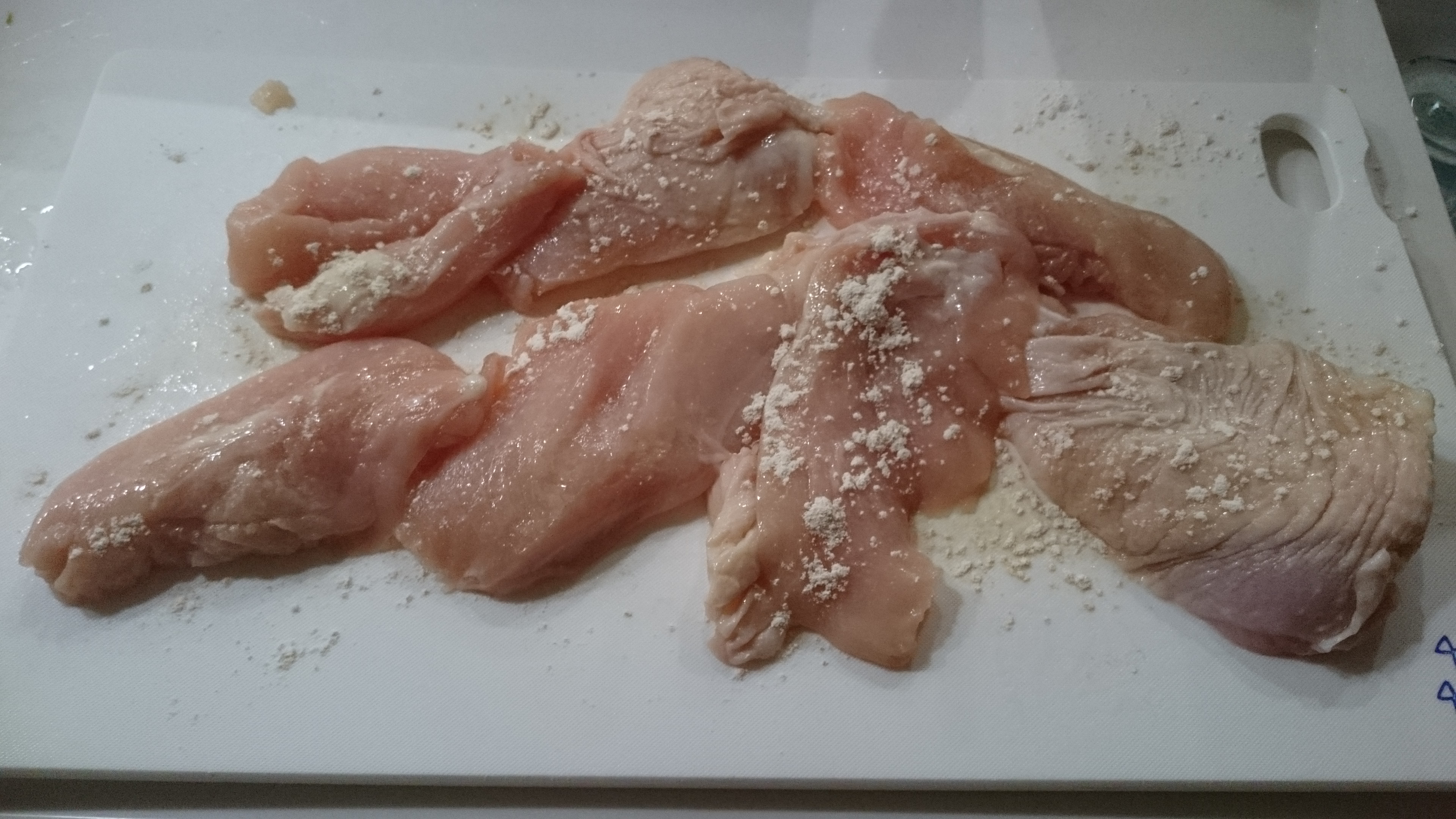 鳥むね肉を四つくらいに削ぎ切りする。5分おく。