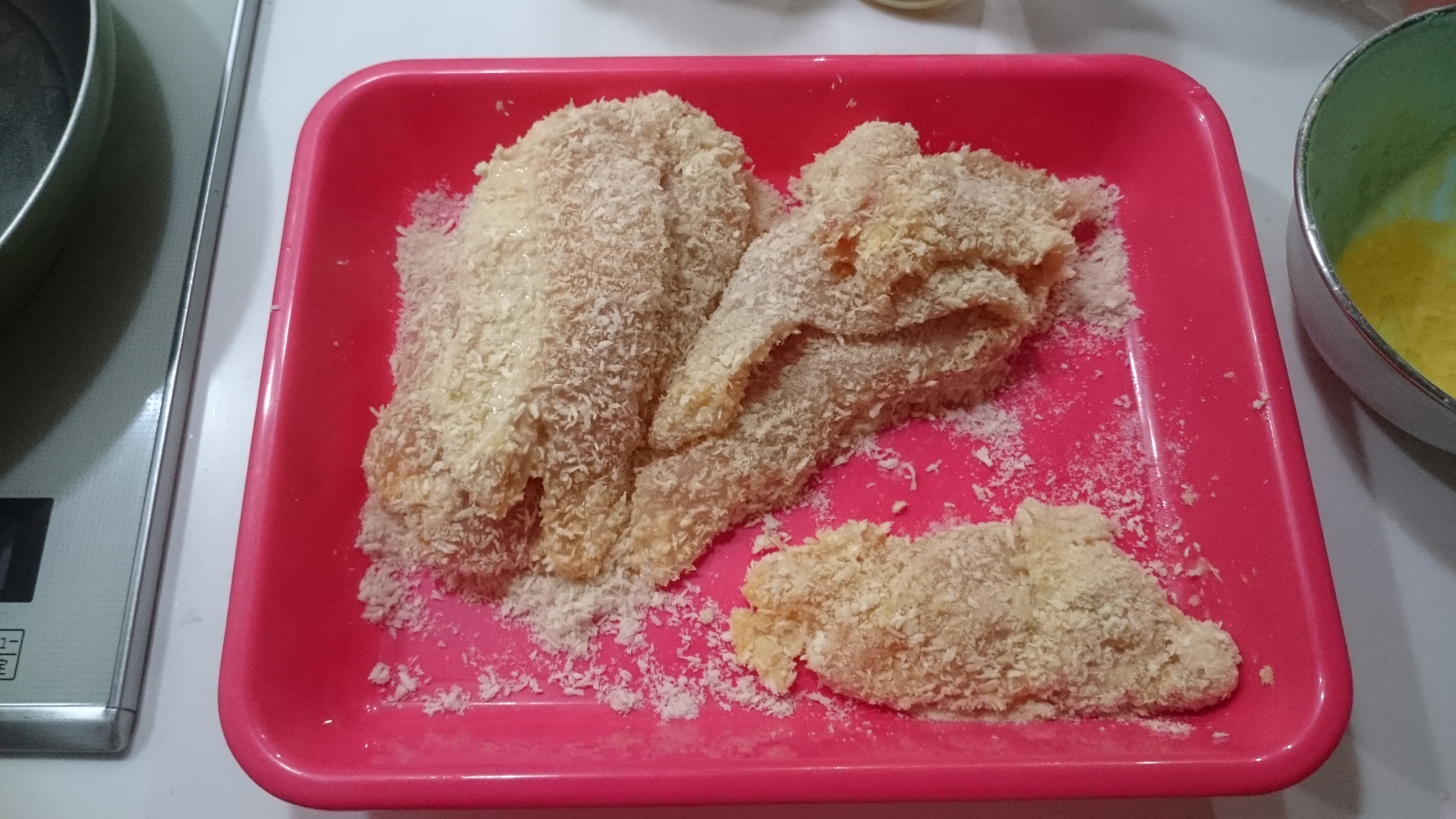 小麦粉、卵、パン粉をつける。揚げ焼き。