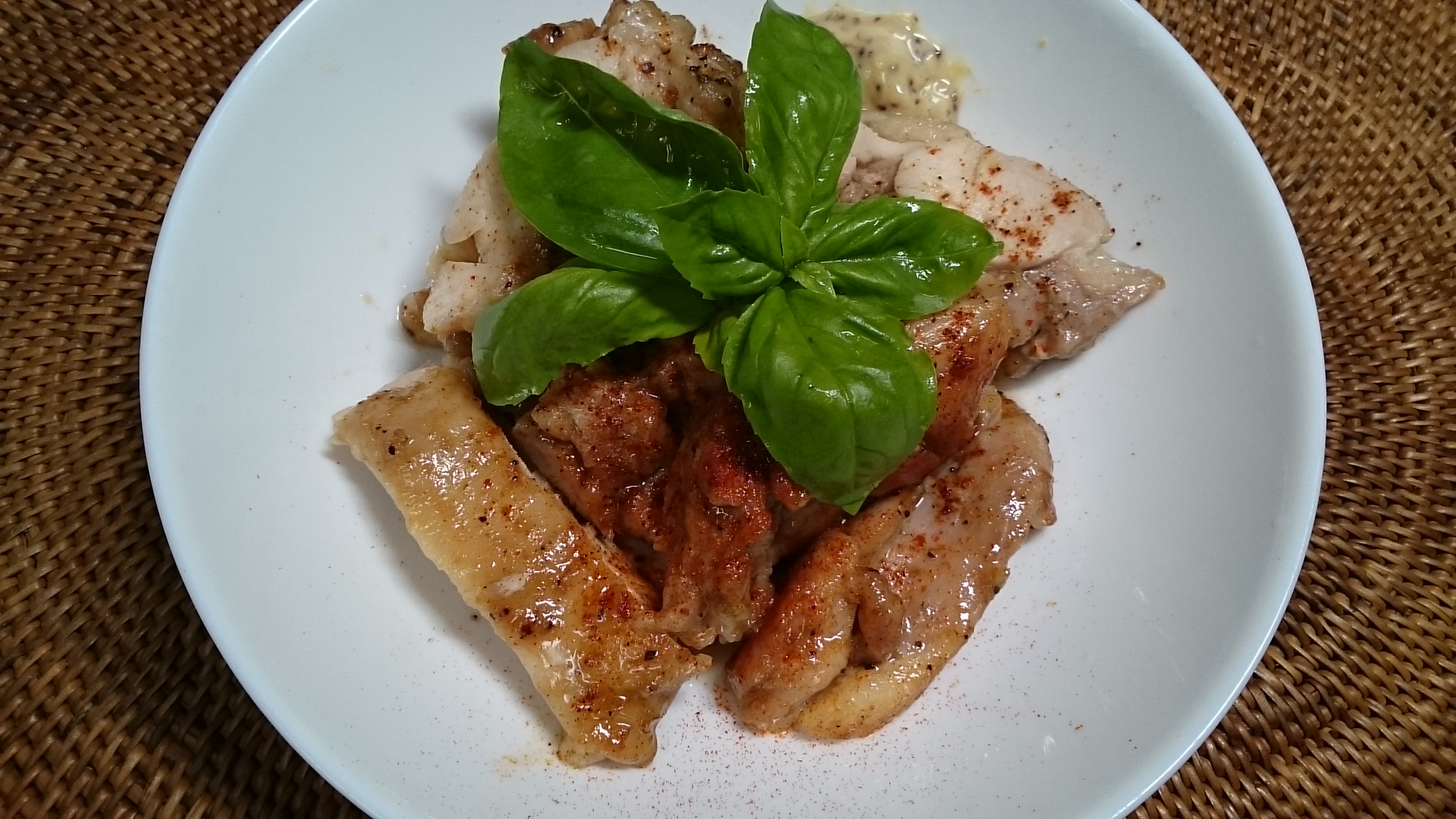 お肉やわらかの素をまぶしてしばらくおいたのちソテーして、仕上げに粒マスタードとバジルを添える。