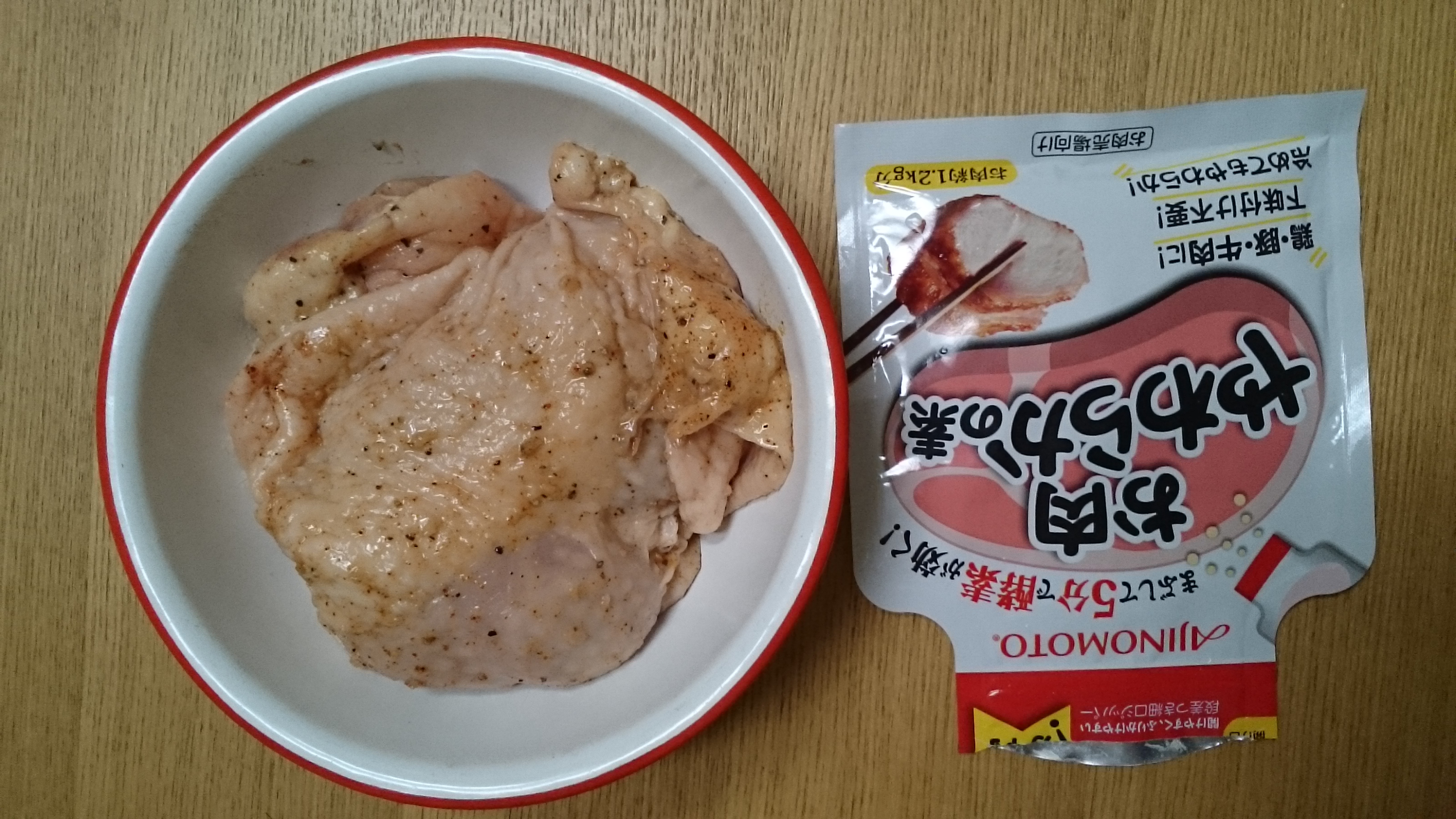 あらかじめ鶏モモ肉にニンニクを良く揉み込んでおく。