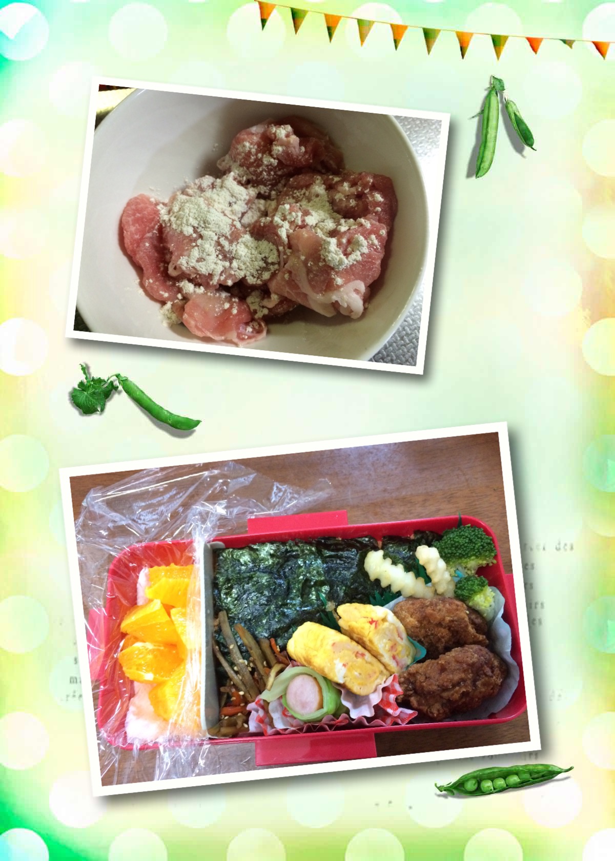 我が家のこども弁当はいつものり弁。大好きなんです。 そのおかずに竜田揚げ。これを「お肉やわらかの素」で下味つけました。 お醤油の風味もつけたいけれど、 「お肉やわらかの素」を使ったので、いつもよりお醤油は控えめで。 (調味料はいつも目分量のため、ちゃんと書けずにごめんなさい) 小麦粉と片栗粉を3:7くらいにするのが我が家の定番です♪
