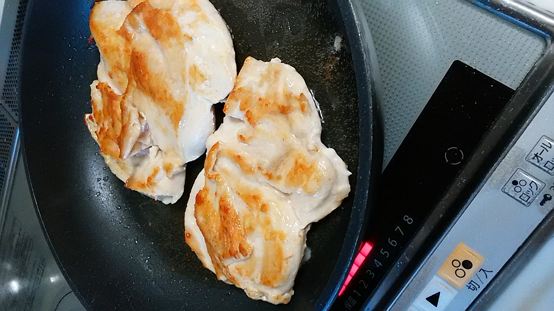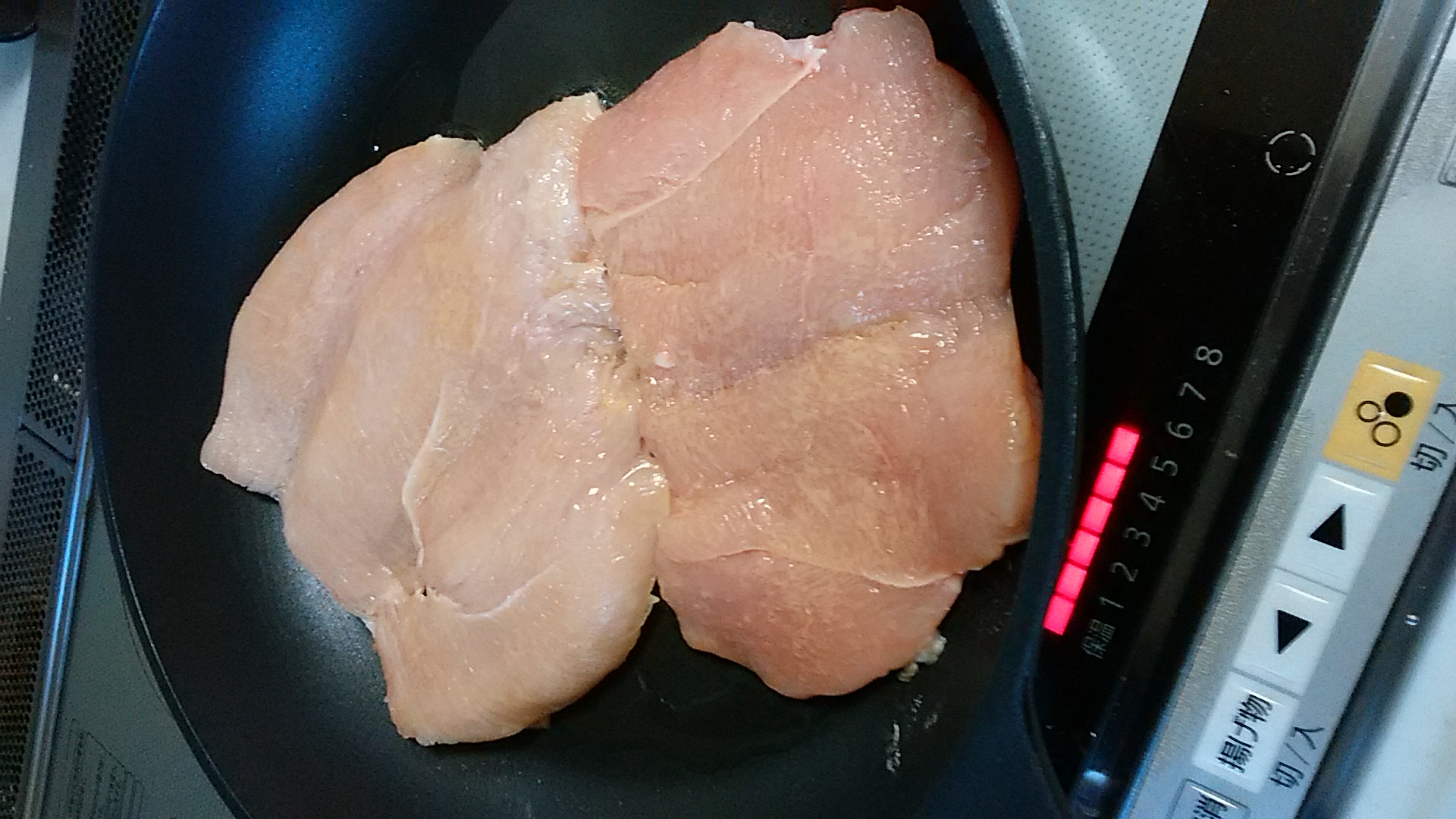 鶏ムネ肉は適当な厚さになるように開く。 皮目にフォークで穴をあけ、お肉やわらかの素を両面まぶし、5分おく。
