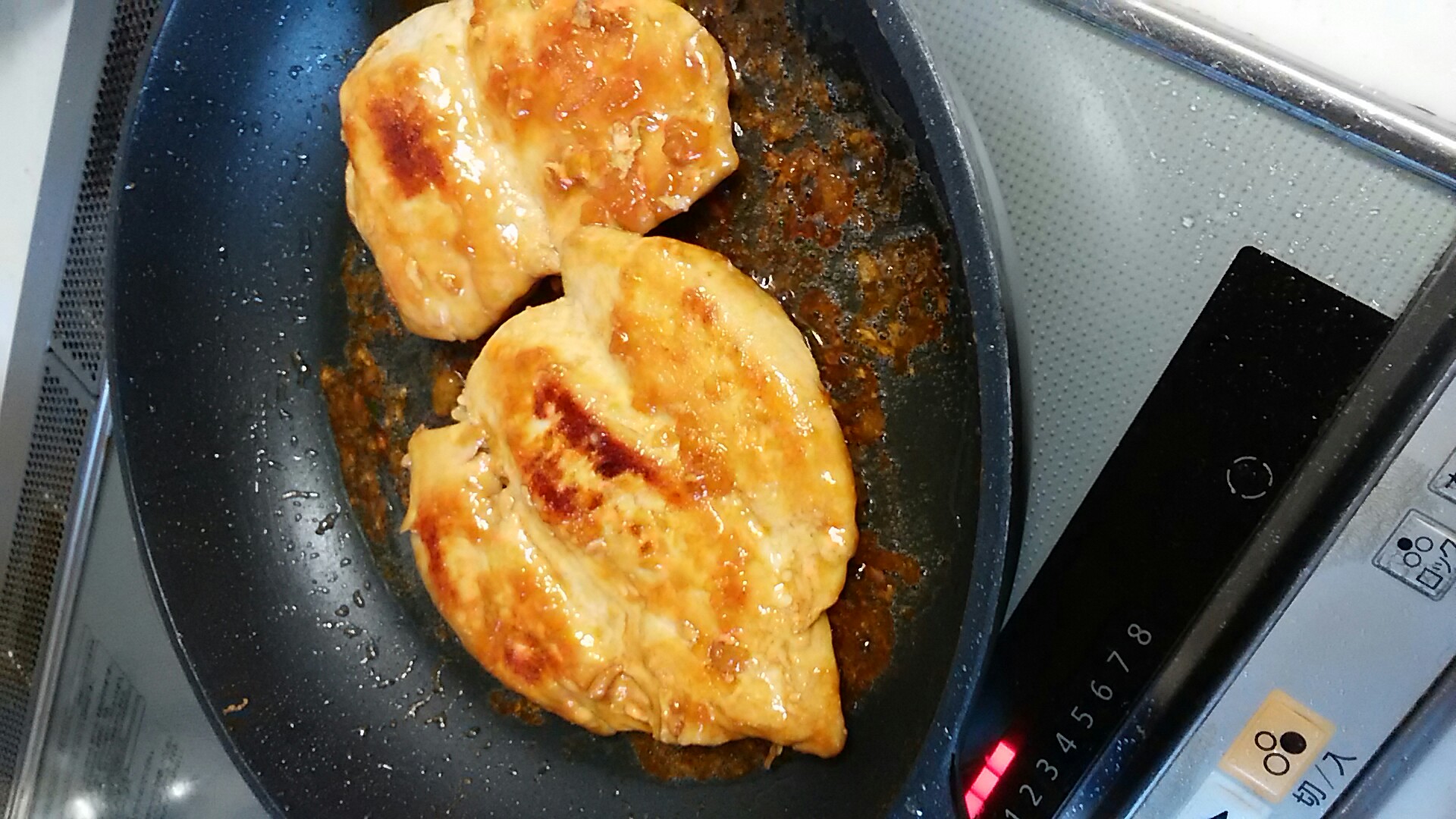 柚子ジャムと醤油で照り焼きにしました。お肉やわらかの素の味付けが付いているので、醤油少なめにしました。