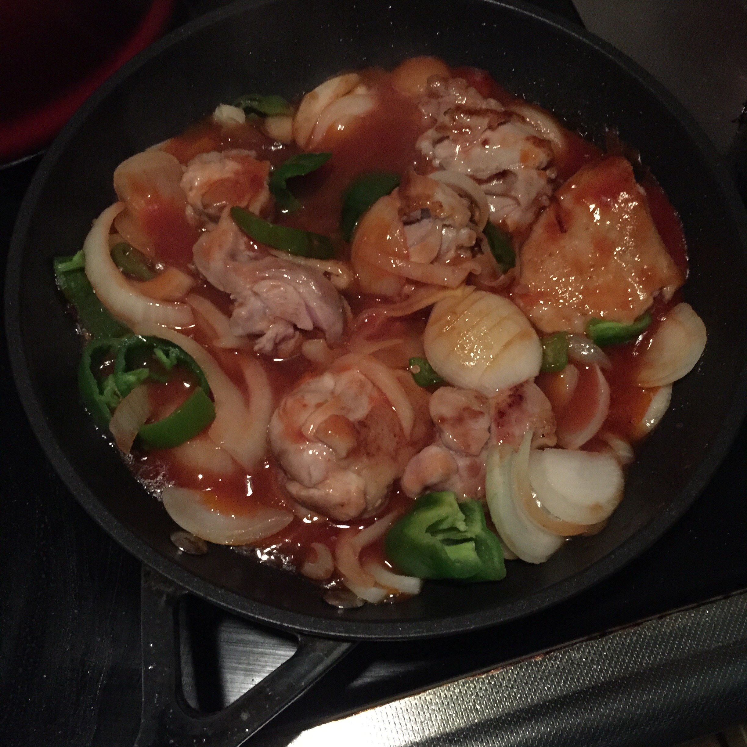 お肉柔らかな素をふりかけて、鶏肉に焦げ目をつけ、たまねぎ、ピーマンも炒めて、最後に片栗粉をいれた、ケチャップソースを流し入れて完成。