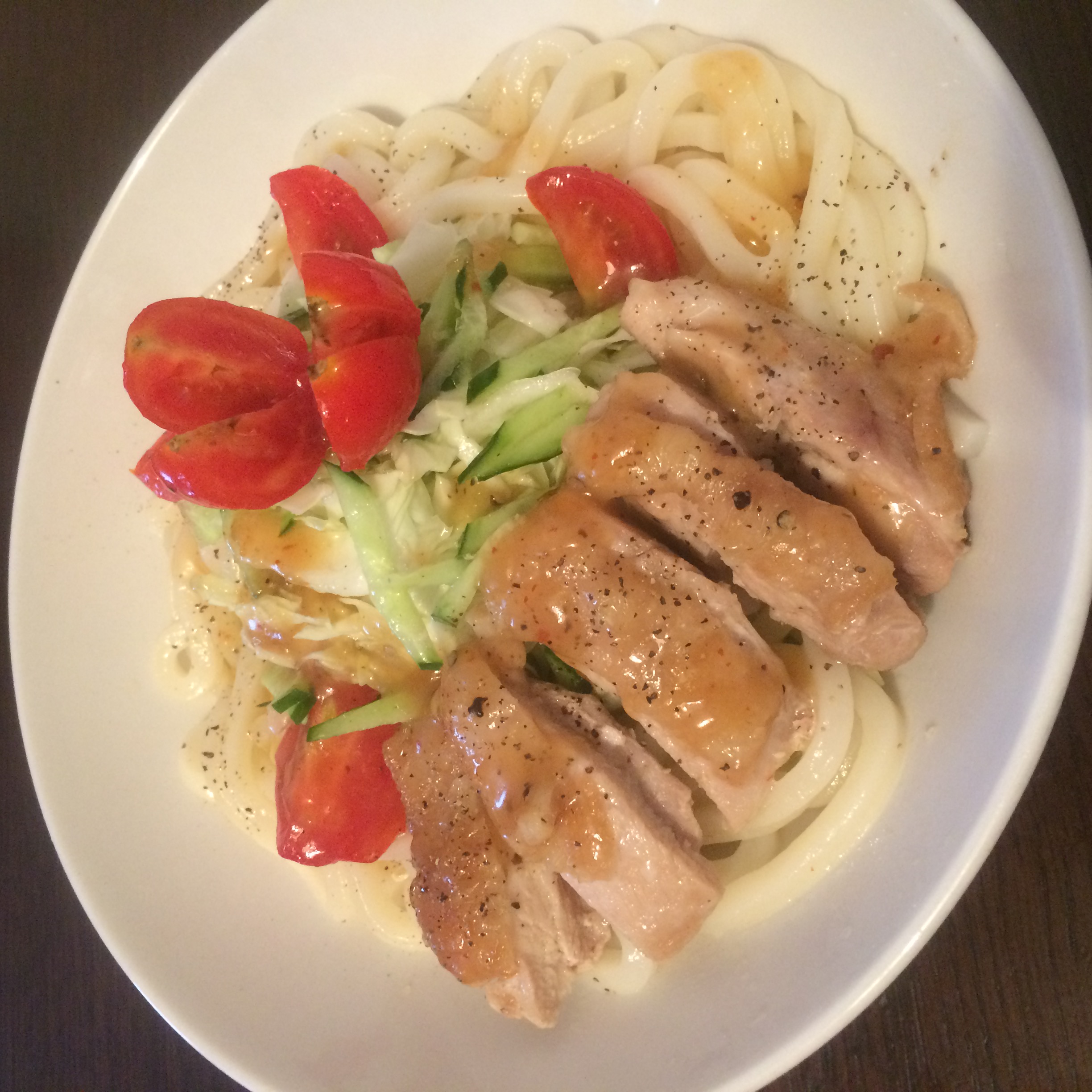 うどんを皿に盛り付け肉を盛り野菜も飾れば完成