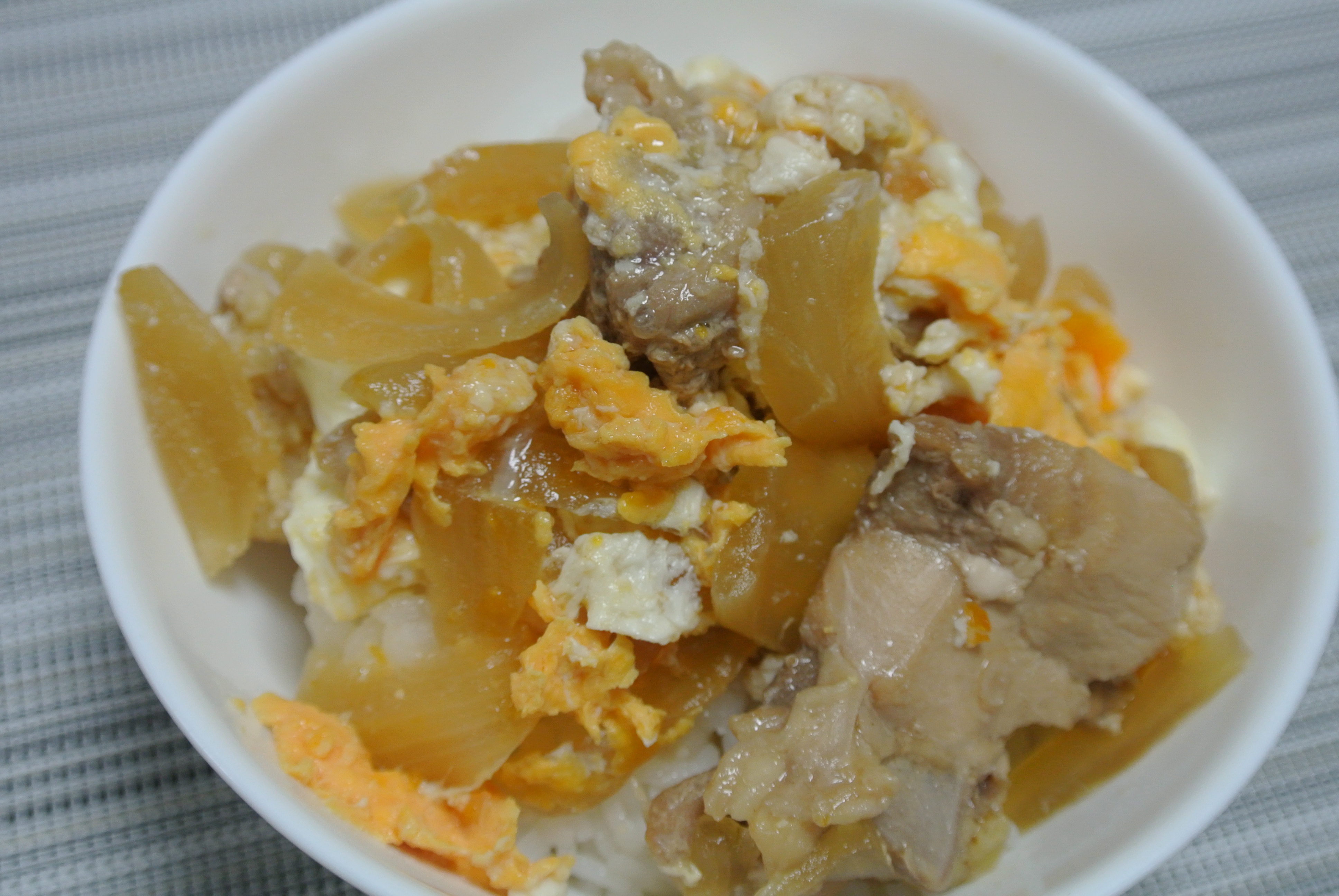 玉ねぎと鶏肉をめんつゆなどで煮て、最後に卵でとじて出来上がり。